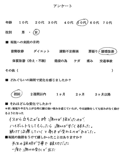 イスから立ち上がる時痛みが強かったのが、ハイボルトをしてもらったら痛みがすごく弱まった。続けて治療していくと身体が変わるのがわかった。